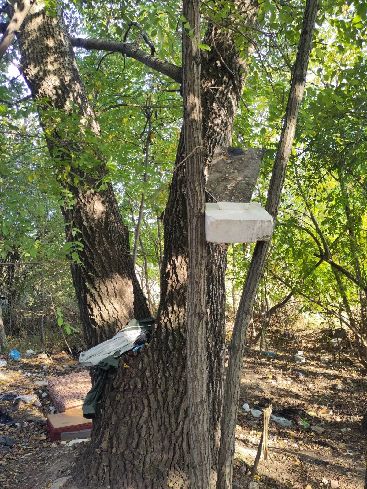 Mirror and socks on branches in a Serbian informal living site, August 2025, credits: Sofie Noe Rosenblad